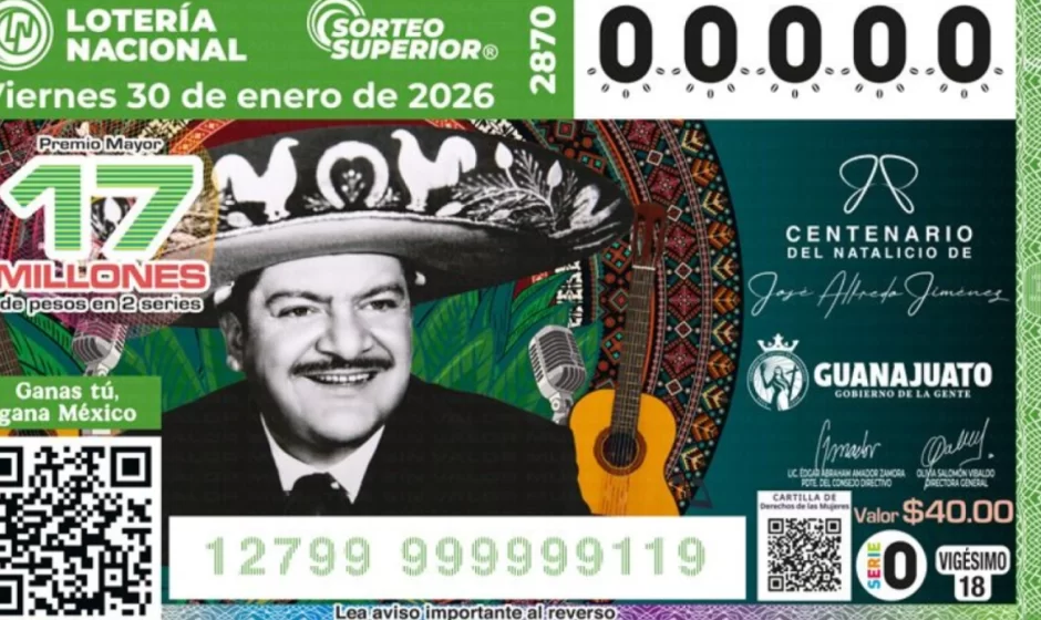 El Sorteo Superior No. 2870, dedicado a José Alfredo Jiménez, contará con un Premio Mayor de 17 millones de pesos en dos series y una bolsa repartible de 51 millones de pesos en premios. Los cachitos ya están disponibles en más de 11 mil puntos de venta en todo el país y en la plataforma miloteria.mx, con un costo de 40 pesos por cachito y 800 pesos por la serie completa. El sorteo será transmitido en vivo a las 20:00 horas a través del canal de YouTube institucional Sorteos Tradicionales de la Lotería Nacional.