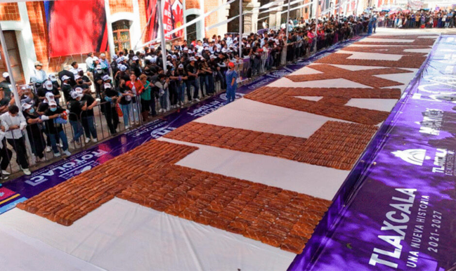 El logro fue certificado oficialmente por Alfredo Arista, adjudicador de Guinness World Records, quien confirmó que la marca fue alcanzada al unir 2 mil 581 piezas de pan que formaron la palabra “Tlaxcala”.